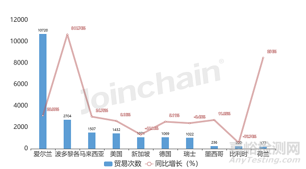 在出口方面,2022年度愛爾蘭起搏器出口貿(mào)易次數(shù)達10720次,位居全球出口第一;波多黎各排名第二,出口貿(mào)易次數(shù)為2704次;馬來西亞排名第三,出口貿(mào)易次數(shù)為1507次。
