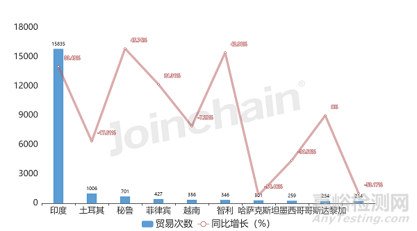 在進口方面,2022年度印度起搏器進口貿(mào)易次數(shù)為15835次,位居全球進口第一;其次是土耳其和秘魯,進口貿(mào)易次數(shù)分別為1006次和701次。