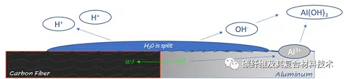 這種化學(xué)反應(yīng)涉及到鋁與碳纖維層壓板的共享離子。當鋁釋放電子時,形成鋁離子(Al3+)。當水分子分裂時,這些鋁離子將與氫氧根離子(OH-)結(jié)合,從而又形成氫氧化鋁Al(OH)3,它可以在鋁的表面上以白色白堊狀物質(zhì)的形式留下。