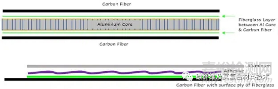 目前,防止兩種材料之間腐蝕的最常見解決方案是在兩種導(dǎo)電材料之間建立物理屏障或隔離點。這可以通過幾種不同的方式實現(xiàn),比如玻璃纖維不具有導(dǎo)電性能,這使其成為阻止腐蝕機制的絕佳選擇。玻璃纖維可以添加到鋁芯與芯纖維的疊層中(如下所示)或CF和鋁基板可以粘合在一起的地方。