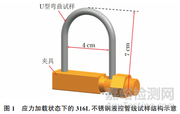 試驗(yàn)材料為某海上稠油熱采井用316L不銹鋼液控管線,管外徑為6.35mm,內(nèi)徑為3.75mm,壁厚為1.3mm,其化學(xué)成分(質(zhì)量分?jǐn)?shù)%)為0.03C,0.75Si,2.00Mn,0.045P,0.03S,16.70Cr,10.02Ni,2.03Mo,0.10N,余Fe。為研究應(yīng)力加載對(duì)液控管線在熱采服役環(huán)境中腐蝕損傷的影響,分別制備應(yīng)力加載和無應(yīng)力加載2種狀態(tài)的試樣,其中:應(yīng)力加載狀態(tài)下的試樣是按照GB/T 15970.3—1995用兩步法制作的U 型彎曲試樣,其結(jié)構(gòu)如圖1所示;無應(yīng)力加載狀態(tài)下的試樣為長(zhǎng)度10cm的直管試樣。
