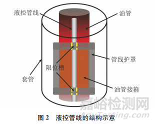 液控管線通過管線護(hù)罩上的限位槽限位在油管接箍上,如圖2所示。在高溫環(huán)境中液控管線受熱發(fā)生熱膨脹,由于油管接箍與液控管線的熱膨脹系數(shù)不同,且管線護(hù)罩對(duì)液控管線有限位作用,阻礙液控管線的熱膨脹釋放,因此在實(shí)際生產(chǎn)過程中液控管線會(huì)產(chǎn)生沿軸向的熱應(yīng)力,同時(shí)也會(huì)產(chǎn)生一定的弧度。316L不銹鋼在室溫(25℃)以及200,260,300,350℃時(shí)的屈服強(qiáng)度分別為276,230,215,205,193MPa,泊松比約為0.3。316L不銹鋼與N80油管鋼(油管接箍材料)的彈性模量和熱膨脹系數(shù)見表1。油管接箍外壁與套管內(nèi)壁間距為液控管線在環(huán)空中弧的最大變形范圍。熱采井用套管的內(nèi)徑為205.7mm,外徑為219.1mm,通徑為202.5mm;油管的內(nèi)徑為100.3mm,外徑為120.6mm;接箍外徑為141.5mm。由此可以確定,液控管線在環(huán)空中弧的最大變形范圍為32mm,即模型的最大變形弧的高度為32mm。