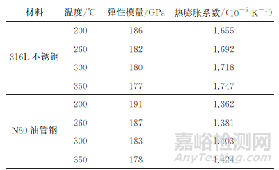 表1 316L不銹鋼與 N80油管鋼的熱膨脹系數(shù)和彈性模量