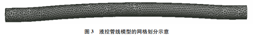 根據(jù)實(shí)際油管長(zhǎng)度,定義這段帶有弧形的液控管線弦長(zhǎng)為10000mm,外徑為6.35mm,內(nèi)徑為3.75mm,兩端受液控管線護(hù)罩約束的部位保持直線,端部直管段長(zhǎng)200mm,中部弧的高度為32mm??紤]到液控管線長(zhǎng)徑比過大,為減小計(jì)算誤差和提高網(wǎng)格劃分精度,按照尺寸10∶1比例建立液控管線模型并利用AnsysWorkbench軟件對(duì)其熱應(yīng)力進(jìn)行有限元計(jì)算。對(duì)模型兩端直管段進(jìn)行完全固定約束,使其自由度為0,對(duì)中部位置進(jìn)行位移約束。由于液控管線的管徑較小、管壁較薄,為保證有限元計(jì)算結(jié)果的準(zhǔn)確性及合理性,在網(wǎng)格劃分時(shí),采用全局單元尺寸控制網(wǎng)格大小,網(wǎng)格單元為四面體單元,如圖3所示。
