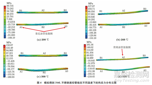 (1)模擬得到316L不銹鋼液控管線在200~350℃溫度下的最大熱應(yīng)力出現(xiàn)在接近油管接箍側(cè)區(qū)域,其數(shù)值隨溫度的升高而增大,在350℃時(shí)的最大熱應(yīng)力為181MPa,約為屈服強(qiáng)度的93%。