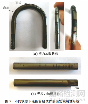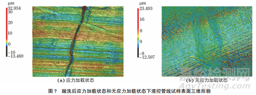 由圖7可以看出,在酸洗后應(yīng)力加載狀態(tài)下試樣表面出現(xiàn)明顯的徑向裂紋,無應(yīng)力加載狀態(tài)下試樣表面較平整,未發(fā)現(xiàn)裂紋。這表明,應(yīng)力加載能夠促進(jìn)液控管線表面裂紋的形成,并加快液控管線的腐蝕失效。