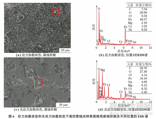 由圖6可以發(fā)現(xiàn):應(yīng)力加載狀態(tài)下的U型試樣表面腐蝕產(chǎn)物分布均勻,主要成分為金屬氧化物,且氧化物間隙夾雜部分礦物鹽;無應(yīng)力加載狀態(tài)下的直管試樣的成分與應(yīng)力加載狀態(tài)下的差別不大,但氯離子含量明顯較高。這是因?yàn)閼?yīng)力加載導(dǎo)致液控管線表面鈍化膜出現(xiàn)大面積破損而發(fā)生腐蝕,而無應(yīng)力加載狀態(tài)下的直管試樣僅在局部位置發(fā)生點(diǎn)蝕,氯離子在點(diǎn)蝕坑內(nèi)富集。對(duì)比發(fā)現(xiàn),應(yīng)力加載狀態(tài)下的液控管線出現(xiàn)大面積的腐蝕,腐蝕程度更嚴(yán)重。