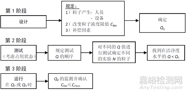 筆者認(rèn)為,此項內(nèi)容是ISO 14644-16 標(biāo)準(zhǔn)中實施潔凈室節(jié)能的核心、也是最實際的舉措。該標(biāo)準(zhǔn)明確指出,此項測試有別于ISO 14644 系列標(biāo)準(zhǔn)中-1、-2、-3 和-4 等部分標(biāo)準(zhǔn)所規(guī)范的風(fēng)量測試的目的,而是在這些測試以外的,一項額外的風(fēng)量測試項目。其目的是確定所設(shè)計風(fēng)量與工藝的適合性。也就是說潔凈室設(shè)計時,因為種種不確定性,不得不層層加碼而留有相當(dāng)?shù)脑A?。只有在潔凈室建成或翻新改造完成后,才有可能通過實際測量以確定,在滿足工藝需求前提下,有無減少風(fēng)量或調(diào)低風(fēng)速,以實現(xiàn)節(jié)能的目標(biāo)。ISO 14644-16 標(biāo)準(zhǔn)給出的設(shè)計-測試-運(yùn)行,并最終確定潔凈室送風(fēng)量的步驟順序如圖1所示。
