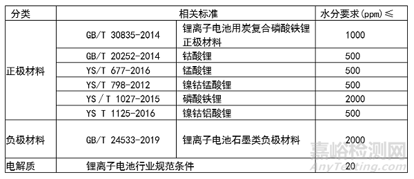 一般情況下,都最終需要確保材料的含水量低于相關(guān)標(biāo)準(zhǔn)的要求。在相關(guān)國標(biāo)或行業(yè)規(guī)范中,對鋰電材料含水量有如下的要求: