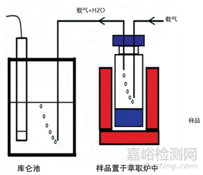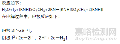 其原理是當(dāng)儀器電解池中的卡氏試劑達(dá)到平衡時(shí),加入含水的樣品,樣品中的水分將參與到I2、SO2 的氧化還原反應(yīng),消耗了的I2 在陽極電解而重新產(chǎn)生,從而使樣品中的水分不斷被耗盡為止。