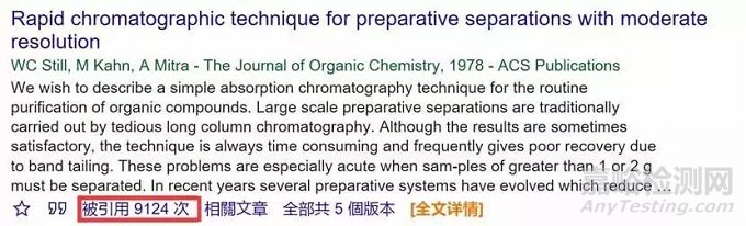 記得在讀研期間第一次接觸到有機狗必備技能“過柱子”時,指導我們的師兄給我們推薦了一篇1976年發(fā)表的JOC“神文”——“Rapid chromatographic technique for preparative separations with moderate resolution”,這篇文章的引用超過9000次(如圖1),這是一個非常驚人的數(shù)據(jù),可見影響之廣泛深遠。