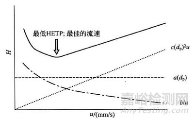 第一項[a(dp)]代表顆粒度和柱床填裝的優(yōu)劣程度,第二項(b/u)代表軸向擴散,第三項[c(dp)2u]代表傳質(zhì)。所擬合的理論曲線如圖2: