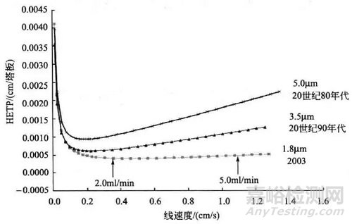 但是填料的顆粒度也同樣影響最佳流速。隨著填料技術的發(fā)展,越來越小粒徑的填料被用于實際分析中,圖3是不同顆粒度的填料的理論踏板高度與線速度關系的實測曲線: