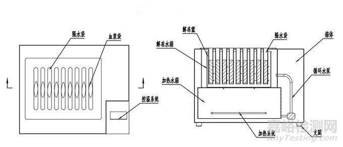 該產(chǎn)品通常由加熱水箱、解凍水箱、循環(huán)管路、控制部分等組成。根據(jù)解凍水箱中解凍槽(解凍夾、解凍籃)的不同可以分為水浴式和隔水式。水浴式為解凍過程中解凍血袋與水直接接觸,隔水式為解凍過程中解凍血袋與水進(jìn)行隔離,兩者不直接接觸。