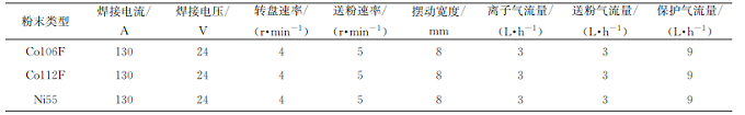 基體選用的是F51雙相鋼,焊粉選用的是Co106F、Co112F、Ni55粉末,利用專用等離子堆焊設(shè)備,分別把 Co106F、Co112F、Ni55粉末雙層堆焊在基體上,堆焊工藝參數(shù)如表1所示。