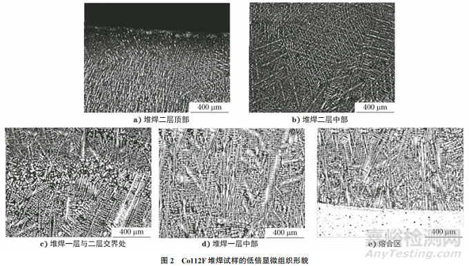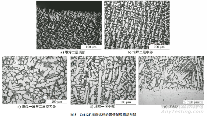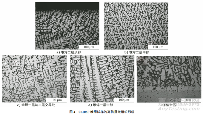 由圖2可知:Co112F堆焊試樣在堆焊一層與二層交界處有著明顯的組織變化,可見雜亂無章的樹枝晶;堆焊二層頂部的等軸晶比較明顯。