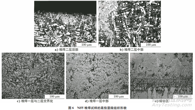 由圖6可知:Ni55堆焊試樣在堆焊一層與基體的交界處、堆焊一層中部、堆焊一層與二層交界處的組織形貌比較緊密,沒有太大的氣孔,以樹枝晶為主;堆焊二層形成了粗大的柱狀晶及樹枝晶;堆焊層頂部形成了細小的樹枝晶。
