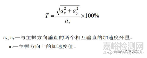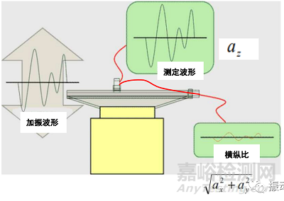 橫縱比的測量,需要借助一個三軸的加速度傳感器和多輸入通道的振動控制儀來完成。三軸加速度傳感器分別對應上圖中的Z方向(主振方向)、X方向(XOY平面內的X軸)、Y方向(XOY平面內的Y軸)。裝載好試驗體,將三軸傳感器固定在需要測量橫縱比的檢測點(一般建議臺面中心處)上,按照試驗條件進行試驗,通過試驗數(shù)據(jù)和計算公式,即可得到試驗條件下,各個頻率對應的橫縱比。此方法目前國內普遍采用,但需要指出的是此法適用于低頻(50Hz-500Hz)下的測量,高頻下誤差還是比較大的,因為壓縮型三軸加速度傳感器高頻下的橫向頻響差(該類型加速度傳感器自身的橫縱比差)。