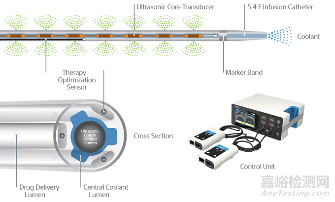 Ekosonic超聲輔助溶栓系統(tǒng)是目前唯一被FDA批準(zhǔn)上市的UA-CDT設(shè)備。Ekosonic超聲輔助溶栓系統(tǒng)由注藥導(dǎo)管、超聲核心導(dǎo)線和控制單元組成。注藥導(dǎo)管為空心管,有許多側(cè)孔便于釋放溶栓藥物,其前端為一個提示治療區(qū)域的影像學(xué)標(biāo)記。根據(jù)不同規(guī)格,超聲核心導(dǎo)線的治療區(qū)域長度為 6-50cm,每間隔 1cm設(shè)置1個超聲換能器,每個超聲換能器釋放的超聲波頻率為2.2GHz,能量為0.5W。溶栓時超聲核心導(dǎo)線需插入注藥導(dǎo)管內(nèi),在輸注溶栓藥物的同時釋放超聲波??刂茊卧獮檎麄€系統(tǒng)供能,并根據(jù)治療區(qū)域的溫度,實時調(diào)節(jié)超聲波功率。