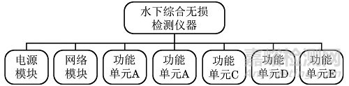 可靠性評(píng)估對(duì)象主要為自主研制的水下綜合無損檢測儀器,該設(shè)備由7個(gè)核心單元組成,包括電源、通訊網(wǎng)絡(luò)和5個(gè)無損檢測功能單元,均安裝于密封艙內(nèi),通過密封接頭實(shí)現(xiàn)艙內(nèi)外檢測數(shù)據(jù)采集及信號(hào)傳輸,具備渦流、超聲、射線檢測等多種檢測功能,具有單方法、多方法等多種檢測模式,其功能結(jié)構(gòu)框圖如圖1所示。