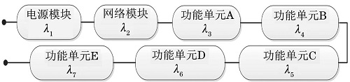 鑒于該儀器現(xiàn)階段初步設(shè)計(jì)已完成,元器件規(guī)格、數(shù)量和環(huán)境、質(zhì)量系數(shù)等都已確定,因此筆者選擇元器件計(jì)數(shù)法進(jìn)行基本可靠性預(yù)計(jì)。進(jìn)行基本可靠性預(yù)計(jì)時(shí),構(gòu)成產(chǎn)品的所有單元都應(yīng)包括在模型內(nèi),因此建立的可靠性模型為串聯(lián)模型。儀器基本可靠性框圖如圖2所示。