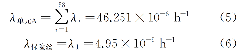 查閱標(biāo)準(zhǔn)GJB/Z 299C-2006和MIL-HDBK-217F-2000獲得πQi和λGi,計(jì)算出各元器件失效率λi;再按照式(4)計(jì)算出各單元的失效率。由于該儀器包含7個(gè)核心功能單元,且每個(gè)單元所含元器件數(shù)量較多,共計(jì)413個(gè),筆者不在此一一列出,僅以功能單元A為例,給出單元A和保險(xiǎn)絲的失效率計(jì)算方法: