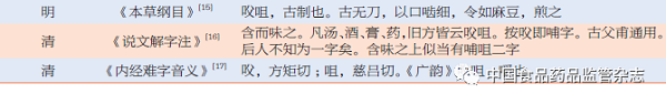 ?咀作為一種傳統(tǒng)中藥加工方式,最早見于《黃帝內經》中,“用淳酒二十斤,蜀椒一斤,干姜一斤,桂心一斤,凡四種,皆?咀,漬酒中”[9],即將藥物經過?咀處理后再浸于酒中。東漢《金匱玉函經》“凡?咀藥,欲如大豆,粗則藥力不盡”[10],說明藥物經?咀后的規(guī)格大小為“如大豆”,其處理的目的是為了促進藥物療效的發(fā)揮。南北朝時期《本草經集注》“凡湯酒膏藥,舊方皆云?咀者,謂秤畢搗之如大豆者,又使吹去細末……今皆細切之,較略令如?咀者,差得無末,而粒片調和,于藥力同出,無生熟也”[11],陶弘景此處對?咀的解釋較為詳盡,描述其舊時為“搗”至“如大豆”,今為“細切”并且需要注重共煎藥物的粒度差異。唐代《新修本草》“咀,正謂商量斟酌之”[12],對咀賦予了商酌的含義。宋代對經?咀加工過的藥物形狀描述為“粗末”。元代記載“?咀……以口咬細,令如麻豆”。明代《本草綱目》“?咀,古制也。古無刀,以口嚙細,令如麻豆,煎之”,此處認為?咀就是以口齒研磨,將藥物?咀如麻豆后,再行煎煮。清代對?咀的理解為“含而味之”“嚼也”,多與口齒相關聯(lián)。近代《辭源》亦有對?咀的描述,“咀嚼。古代煎藥先把藥料切碎為末,好像經過咀嚼似的,叫?咀”,用?咀一詞來表述藥物加工后的形態(tài)特征。由此可見,中藥?咀應用歷史悠久,主要是將藥物處理加工以便于煎煮,其規(guī)格多描述為“如大豆”“如麻豆”及“粗末”等。中藥?咀的歷代演變如表1 所示。