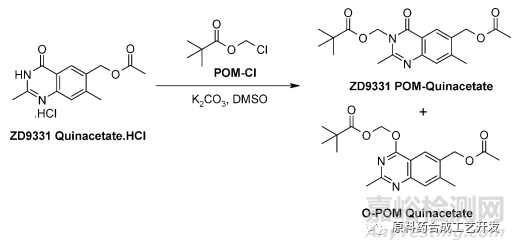 quinacetate鹽酸鹽和POM-Cl的N的烷基化反應(yīng),主要雜質(zhì)是O的烷基化。方程式如下: