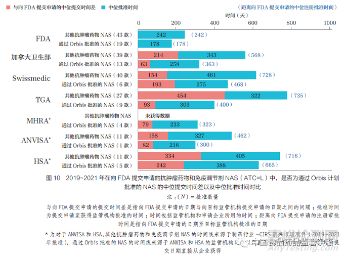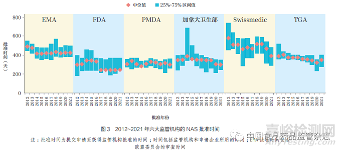 過去十年,在不同的監(jiān)管機(jī)構(gòu)獲批NAS 數(shù)量整體呈逐漸增加的趨勢(shì), 但FDA 和加拿大衛(wèi)生部獲批數(shù)量趨于平穩(wěn);從審批周期上來說,以FDA 的中位批準(zhǔn)時(shí)間最短,本文推測(cè)歸因于廣泛應(yīng)用監(jiān)管促進(jìn)路徑;另外本文從共同審批情況對(duì)提交時(shí)間差和審批時(shí)間,以及在不同監(jiān)管機(jī)構(gòu)之間的差異進(jìn)行了總結(jié)和分析,并分析了Access 工作聯(lián)盟和Orbis 計(jì)劃對(duì)審評(píng)效率的影響。本文詳實(shí)地介紹了六大監(jiān)管機(jī)構(gòu)NAS 批準(zhǔn)時(shí)間的影響因素,包括加速審評(píng)程序,罕見病藥,監(jiān)管促進(jìn)路徑,治療領(lǐng)域不同,新數(shù)據(jù)來源(如真實(shí)世界數(shù)據(jù))等方式和途徑。