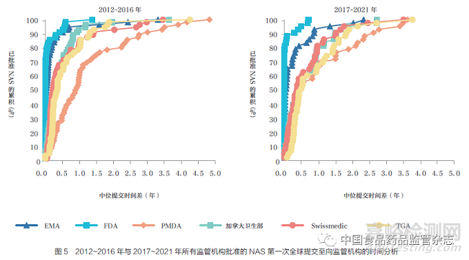 本文通過比較六大監(jiān)管機(jī)構(gòu)2012~2016 年(56 款)與2017~2021年(43 款) 間批準(zhǔn)的NAS 提交時(shí)間差分布,進(jìn)一步分析了企業(yè)申報(bào)策略的差異。結(jié)果表明,PMDA 的中位提交時(shí)間差由2012~2016 年的1 年縮短至2017~2021 年半年左右,如圖5 所示。2017~2021 年P(guān)MDA 分布曲線的收緊,表明第一次全球提交后向PMDA 提交所需的時(shí)間與加拿大衛(wèi)生部、Swissmedic和TGA 的時(shí)間相近。