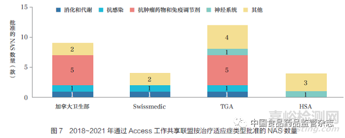 Access 聯(lián)盟是一個(gè)由“志同道合”的監(jiān)管機(jī)構(gòu)于2007 年成立的中等規(guī)模的聯(lián)合體,旨在促進(jìn)更多合作和提升監(jiān)管一致性,其目標(biāo)是最大限度地開展國(guó)際合作,減少重復(fù)性審評(píng),提升各監(jiān)管機(jī)構(gòu)的效能,以確?;颊呒皶r(shí)獲得高質(zhì)量、安全和有效的藥物。各監(jiān)管機(jī)構(gòu)作為Access 工作共享聯(lián)盟的成員,負(fù)責(zé)審評(píng)申請(qǐng)資料的不同部分。盡管各監(jiān)管機(jī)構(gòu)之間共享審評(píng)結(jié)果,但每家監(jiān)管機(jī)構(gòu)均有權(quán)對(duì)新藥的批準(zhǔn)(上市許可)與否獨(dú)立做出決定。目前,這種“共享”模式是否能成為一種聯(lián)盟的監(jiān)管機(jī)構(gòu)在區(qū)域和跨區(qū)域間共享資源、簡(jiǎn)化與企業(yè)互動(dòng)的模式備受關(guān)注。本文對(duì)實(shí)施新化學(xué)實(shí)體工作共享倡議的加拿大衛(wèi)生部、Swissmedic、TGA 和新加坡衛(wèi)生科學(xué)管理局(HSA)2018~2021 年的NAS批準(zhǔn)情況進(jìn)行了分析,各監(jiān)管機(jī)構(gòu)共批準(zhǔn)了12 款NAS,如圖7 所示。TGA 是參與所有12 款NAS 工作共享最多的機(jī)構(gòu)(12 款),主要是抗腫瘤藥物和免疫調(diào)節(jié)劑,其次是加拿大衛(wèi)生部(9 款)、HSA(4款)和Swissmedic(4 款)。2021 年1月,英國(guó)藥品和健康產(chǎn)品管理局(MHRA)在該倡議中發(fā)起了工作共享申請(qǐng),但當(dāng)年沒有NAS 獲批。