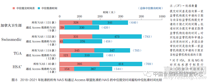 對(duì)于評(píng)估的所有監(jiān)管機(jī)構(gòu), 與2018~2021 年批準(zhǔn)的所有NAS 相比,通過Access 工作共享聯(lián)盟批準(zhǔn)的NAS的中位提交時(shí)間差和中位批準(zhǔn)時(shí)間更短,如圖8 所示,表明工作共享機(jī)制對(duì)不同國(guó)家和地區(qū)注冊(cè)審批時(shí)間(提交時(shí)間差+批準(zhǔn)時(shí)間)具有積極影響。就總體中位注冊(cè)審批時(shí)間而言,與2018~2021 年批準(zhǔn)的所有NAS 相比,Swissmedic 通過Access 批準(zhǔn)NAS 的中位注冊(cè)審批時(shí)間縮短326 天,其次是HSA(225 天)、TGA(224 天)和加拿大衛(wèi)生部(220 天)。