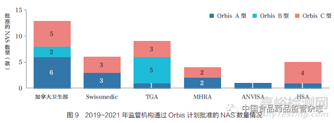 Orbis 計(jì)劃是FDA 腫瘤卓越中心(OCE) 發(fā)起的一項(xiàng)倡議, 旨在讓全球患者更快地獲得有前景的癌癥治療。Orbis 計(jì)劃的合作伙伴合作審評(píng)癌癥藥物提交的資料。根據(jù)FDA 與合作伙伴的提交時(shí)間表,Orbis 計(jì)劃的提交類型分三種:A 型,提交基本上同時(shí)進(jìn)行;B 型,從向FDA 提交到向合作伙伴提交有超過30 天的延遲;C 型,在FDA 已經(jīng)采取監(jiān)管行動(dòng)后提交。2019~2021 年通過Orbis 計(jì)劃批準(zhǔn)的NAS 情況,如圖9 所示,加拿大衛(wèi)生部批準(zhǔn)的NAS 數(shù)量最多(13 款, 大部分為Orbis A 型),其次是TGA(9 款)、Swissmedic(6款)、HSA(5 款)、MHRA(4 款)和巴西國(guó)家衛(wèi)生監(jiān)督局(ANVISA)(1 款)。最常使用的Orbis 類型為C 型,表明最常發(fā)生的情況是FDA 分享其已完成的審評(píng)文件,而不是同時(shí)進(jìn)行審評(píng)。