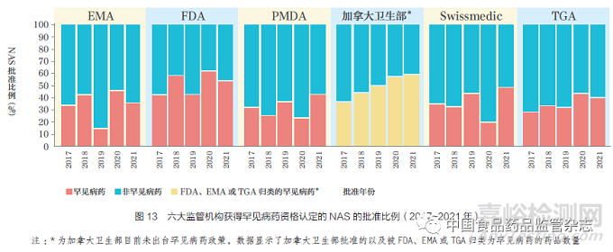 2021 年,各監(jiān)管機(jī)構(gòu)授予罕見病藥資格的NAS 獲批比例均較高,其中TGA(40%),EMA(36%),PMDA(42%),Swissmedic(49%),F(xiàn)DA(54%),如圖13 所示。目前,盡管加拿大衛(wèi)生部未出臺(tái)罕見病藥相關(guān)政策,但其在2021 年批準(zhǔn)的NAS 中有59% 被FDA、EMA 以及TGA 歸類為罕見病藥。