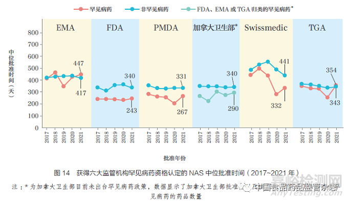本文對(duì)2017~2021 年六大監(jiān)管機(jī)構(gòu)批準(zhǔn)罕見病藥和非罕見病藥的時(shí)間線進(jìn)行了比較, 如圖14 所示。2021 年,F(xiàn)DA 的罕見病藥中位批準(zhǔn)時(shí)間最短(243天),可能由于大部分產(chǎn)品為通過加速審評(píng)獲得批準(zhǔn)。2021 年,PMDA 的罕見病藥中位批準(zhǔn)時(shí)間位居第二(267 天)。在日本獲批的所有罕見病藥NAS 均通過加速審評(píng)進(jìn)行,這是因?yàn)榧铀賹徳u(píng)是PMDA 為解決未滿足的醫(yī)療需求而實(shí)施的激勵(lì)政策。目前,加拿大衛(wèi)生部未出臺(tái)罕見病藥相關(guān)政策,但其在2021 年批準(zhǔn)的20 款NAS 已被FDA、EMA 以及TGA 歸類為罕見病藥,中位批準(zhǔn)時(shí)間為290 天。2021 年EMA 批準(zhǔn)16 種罕見病藥,中位批準(zhǔn)時(shí)間為447 天,其中獲得快速審評(píng)的罕見病藥占13%,而2019 年獲得快速審評(píng)的罕見病藥占50%,2021 年度批準(zhǔn)的4 種罕見病藥的中位批準(zhǔn)時(shí)間為352 天。