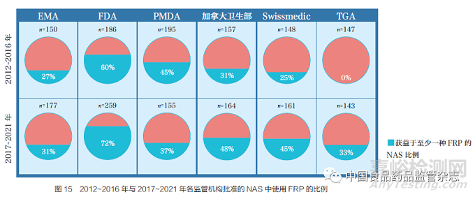 2017~2021 年與2012~2016 年相比,大部分監(jiān)管機(jī)構(gòu)對(duì)FRP 的使用都有所增加。FDA 是使用FRP 最多的監(jiān)管機(jī)構(gòu),其中2017~2021 年72% 的NAS 至少使用了一種FRP,其次是加拿大衛(wèi)生部(48%)、Swissmedic(45%)、PMDA(37%)、TGA(33%)和EMA(31%),如圖15 所示。TGA 是通過FRP 批準(zhǔn)NAS 數(shù)量增加最多的監(jiān)管機(jī)構(gòu),這是由于TGA 最近實(shí)施了5 種FRP[ 優(yōu)先審評(píng)、臨時(shí)批準(zhǔn)、國(guó)外同類監(jiān)管機(jī)構(gòu)(COR)審評(píng)、Access 工作共享聯(lián)盟和Orbis 計(jì)劃]。對(duì)比2012~2016 年與2017~2021 年,PMDA 是唯一通過FRP 批準(zhǔn)NAS 比例略有下降的監(jiān)管機(jī)構(gòu)。