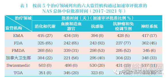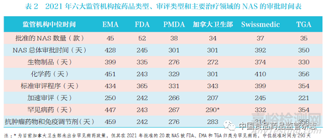 本文按藥品類型、審評(píng)類型和主要治療領(lǐng)域,對(duì)六大監(jiān)管機(jī)構(gòu)在2021 年批準(zhǔn)NAS 的審批時(shí)間進(jìn)行了匯總,見表2。