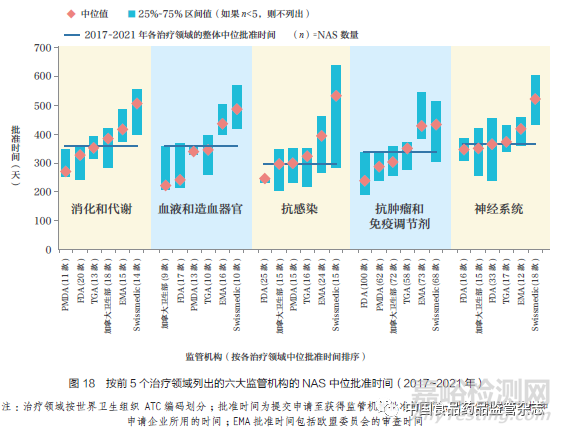 2017~2021 年六大監(jiān)管機(jī)構(gòu)中在前5 的治療領(lǐng)域中批準(zhǔn)的NAS 數(shù)量占全部批準(zhǔn)數(shù)量的77%,其中抗腫瘤藥物和免疫調(diào)節(jié)劑在前5 個(gè)治療領(lǐng)域批準(zhǔn)數(shù)量中占53%,如圖18 所示。抗感染治療藥物的批準(zhǔn)速度略快,其NAS 中位批準(zhǔn)時(shí)間為296 天,抗腫瘤藥物和免疫調(diào)節(jié)劑NAS 為337 天,血液和造血器官治療用NAS 為357 天,消化和代謝領(lǐng)域NAS為358 天,神經(jīng)系統(tǒng)領(lǐng)域NAS 為365 天。PMDA 在消化和代謝以及神經(jīng)系統(tǒng)領(lǐng)域的批準(zhǔn)速度最快,F(xiàn)DA 在抗腫瘤藥物和免疫調(diào)節(jié)劑以及抗感染藥物領(lǐng)域的批準(zhǔn)速度最快。這可能是對(duì)于這5 個(gè)治療領(lǐng)域的藥物,各監(jiān)管機(jī)構(gòu)使用快速審評(píng)通道的頻率更高,如表1 所示。但同時(shí),如圖18 所示(即25%~75% 區(qū)間值條形圖),各監(jiān)管機(jī)構(gòu)在不同的治療領(lǐng)域的批準(zhǔn)時(shí)間也有較大差異。