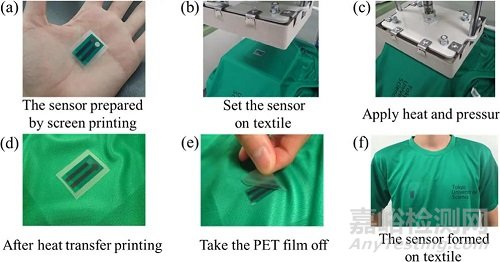 熱轉(zhuǎn)移的過程。(a)PET基底上的絲網(wǎng)印刷傳感器。(b)放置在紡織品上的傳感器。(c)施加熱和壓力。(d)移除PET基底之前的熱傳遞傳感器。(e) PET基底容易剝離。(f)紡織品上的傳感器。| Isao Shitanda et al.