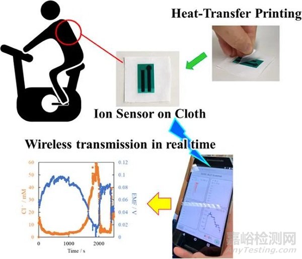 上述提出的傳感器可以轉(zhuǎn)移到纖維基底上,因此可以整合到T恤、腕帶和鞋墊等紡織品中。此外,健康指標,如汗液中的氯離子濃度,可以通過簡單地穿著這些衣物來測量。