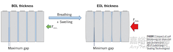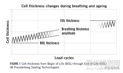 電池間隔層的一個重要功能是柔性機械預(yù)載。除了由電池充放電循環(huán)引起的可逆體積變化之外,電池還會出現(xiàn)由于老化而變厚的現(xiàn)象,稱為膨脹。結(jié)合這兩種效應(yīng),電池厚度可以用鋸齒形曲線來描述,如圖1。鋸齒形的幅度取決于例如電池的總厚度和陽極的硅含量。