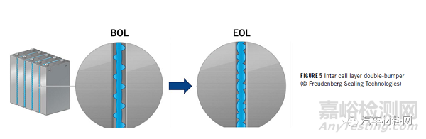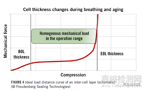 機械層圖6(B),是電池間隔多層的中央核心。主要功能是在操作過程中在模塊中的電池之間提供壓縮力和可變形性。如所示圖4對于典型的方形電池,機械層必須設(shè)計成具有1.5至2.5 mm的變形能力,以實現(xiàn)大約100 kPa的壽命開始(BOL)壓縮,并將壽命結(jié)束(EOL)壓縮限制到大約1.0 MPa??频聦氈饕褂霉柰獜椥泽w,這種彈性體具有可連續(xù)擠出的優(yōu)點,在設(shè)計上有很大的自由度,并且可以通過添加填料輕松調(diào)整材料特性。