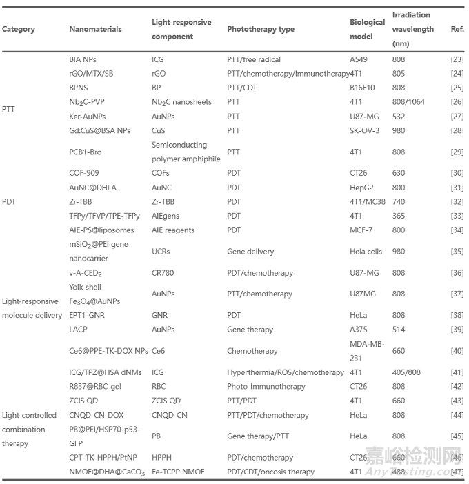 文章總結(jié)了用于癌癥治療的光響應(yīng)納米材料的最新進展(表1)。這些納米材料可用于光熱治療、光動力療法(PDT)、光響應(yīng)分子遞送和光控組合療法(圖1);還討論了光療法當(dāng)前面臨的挑戰(zhàn)和前景。文章旨在強調(diào)光響應(yīng)納米材料在癌癥光療中的重要作用,并為進一步擴大其應(yīng)用提供方向。