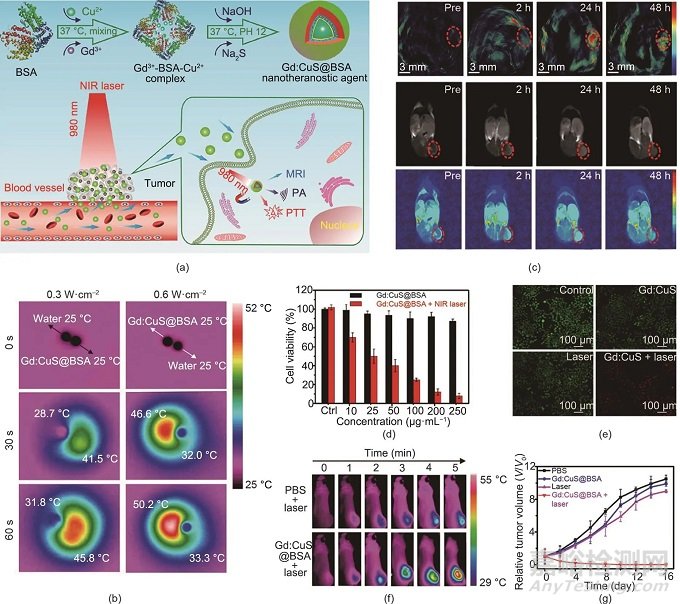 圖2. (a)用于成像引導(dǎo)腫瘤PTT的Gd∶CuS@BSA納米診療劑的示意圖。MRI:磁共振成像。(b)用NIR激光照射(980 nm)的Gd∶CuS@BSA NP的水相Gd∶CuS @ BSA NP液滴和去離子水液滴的紅外熱圖像。(c)在Gd∶CuS@BSA治療前后SK-OV-3腫瘤的PA/MR雙模態(tài)成像。(d)用Gd∶CuS@BSA NP和激光照射(980 nm, 0.6 W?cm-2, 5 min)處理的SK-OV-3細胞的生存率。Ctrl:對照組(用0 μg mL-1 Gd∶CuS @ BSA NP處理)。(e)用不同制劑處理后活/死SK-OV-3細胞的熒光染色。(f)注射不同制劑并進行激光照射(980 nm, 5 min)的SK-OV-3腫瘤的體內(nèi)熱成像。(g)用不同制劑治療的SK-OV-3腫瘤的生長曲線。經(jīng)American Chemical Society許可,© 2016。