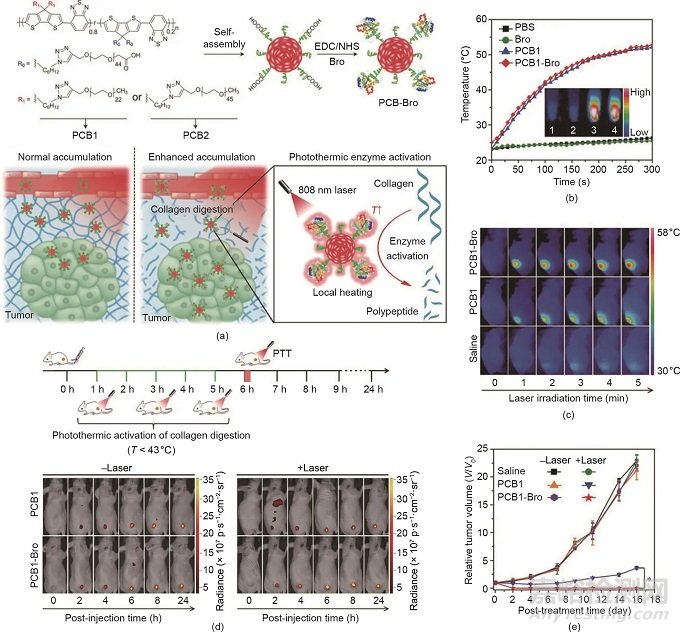 除了無機納米材料外,有機納米制劑在癌癥PTT中也發(fā)揮著重要作用。例如,美國食品藥品監(jiān)督管理局(FDA)批準(zhǔn)的ICG是一種高度生物相容的NIR有機染料,由于其在NIR光激發(fā)下的各種能級轉(zhuǎn)換途徑,已被廣泛應(yīng)用于PTT。此外,Pu等報道了具有用于增強癌癥治療的NIR光熱效應(yīng)的半導(dǎo)體聚合物納米酶(SPN)。如圖3(a)所示,SPN包含作為光熱納米傳感器的半導(dǎo)體兩親性聚合物(PCB)和作為溫度敏感酶的菠蘿蛋白酶(Bro)。在NIR激光照射下,由于SPN的光熱轉(zhuǎn)換活性,局部溫度升高,導(dǎo)致Bro的光熱激活。因此,膠原蛋白(腫瘤細胞外基質(zhì)中最豐富的蛋白質(zhì))被原位消解,導(dǎo)致SPN的腫瘤富集量提升和PTT增強。在808 nm激光照射下,PCB1-Bro基團的溫度在體外 [圖3(b)]和體內(nèi) [圖3(c)]均明顯升高,這證實了PCB1-Bro的高光熱轉(zhuǎn)換效率。此外,與沒有激光照射的滲透深度相比,用NIR激光照射的PCB1-Bro的滲透深度明顯增加,表明光熱增強的膠原蛋白消解已經(jīng)發(fā)生。如圖3(d)所示,在Bro酶光熱激活后,PCB1-Bro處理組的腫瘤熒光信號高于其他組,表明膠原蛋白的消解增強了PCB1-Bro的腫瘤富集。PCB1-Bro的有效積累進一步導(dǎo)致更高的腫瘤溫度和更強的腫瘤生長抑制 [圖3(c)、(e)]。