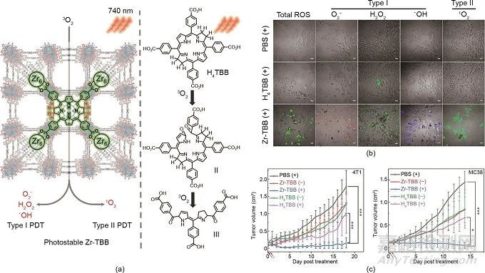 圖4. (a)用于I型和II型PDT的在Zr-TBB中穩(wěn)定的菌綠素配體示意圖。(b)光照射后用不同配方處理的4T1細胞中ROS生成的CLSM圖像。比例尺:20 μm。(c)用不同制劑治療的4T1腫瘤和MC38腫瘤的生長曲線。經(jīng)American Chemical Society許可,© 2020。