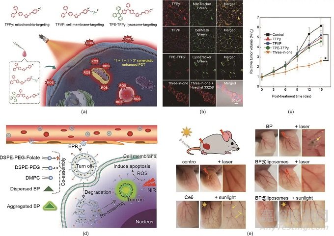 圖5. (a)三種聚集誘導(dǎo)光敏劑的化學(xué)結(jié)構(gòu)和協(xié)同增強PDT的示意圖。(b)在用不同制劑處理的4T1細胞的CLSM圖像中AIEgens的共定位。比例尺:20 μm。(c)用不同制劑處理的4T1腫瘤的生長曲線。(d)用于可活化PDT的AIE-PS脂質(zhì)體的示意圖。DSPE-PEG:二硬脂酰磷脂酰乙醇胺聚乙二醇2000;DMPC:1,2-二肉豆蔻酰-sn-甘油-3-磷酸膽堿。(e)用不同制劑處理的耳朵中的血管。(a)~(c)經(jīng)Wiley-VCH Verlag GmbH & Co. KGaA許可,© 2020;(d)、(e)經(jīng)American Chemical Society許可,© 2019。
