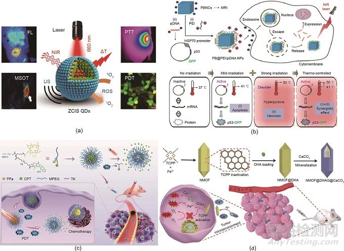 (a)在PTT和PDT的組合治療中ZCIS QD的示意圖。FL:熒光;MSOT:多光譜光聲層析成像:US:超聲波;?T:溫度升高。(b)基因治療和PDT聯(lián)合治療中PB@PEI/HSP70‐p53‐GFP NP的示意圖。(c)MPEG-(TK-CPT)-PPa在化療和PDT聯(lián)合治療中的示意圖。(a)經(jīng)American Chemical Society許可,© 2016;(b)經(jīng)Wiley-VCH Verlag GmbH & Co. KGaA許可,© 2018;(c)經(jīng)Wiley-VCH Verlag GmbH & Co. KGaA許可,© 2020;(d)經(jīng)Wiley-VCH Verlag GmbH & Co. KGaA許可,© 2019。