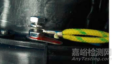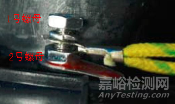 由上述步驟可見,在更換電源軟線過程中2號螺母沒有取下,在其下方被夾緊的接地符號自然也沒有被取下,如圖3所示,所以這種結(jié)構(gòu)符合GB 4706.1-2005標(biāo)準(zhǔn)7.8條款。