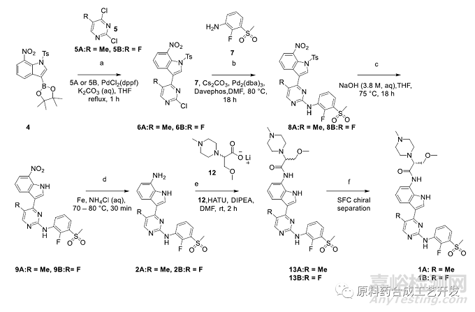 AZD4604(1B,R=F)和AZ13811865(1A,R=Me)的合成路線如下